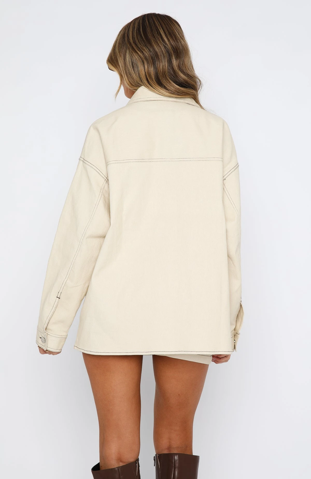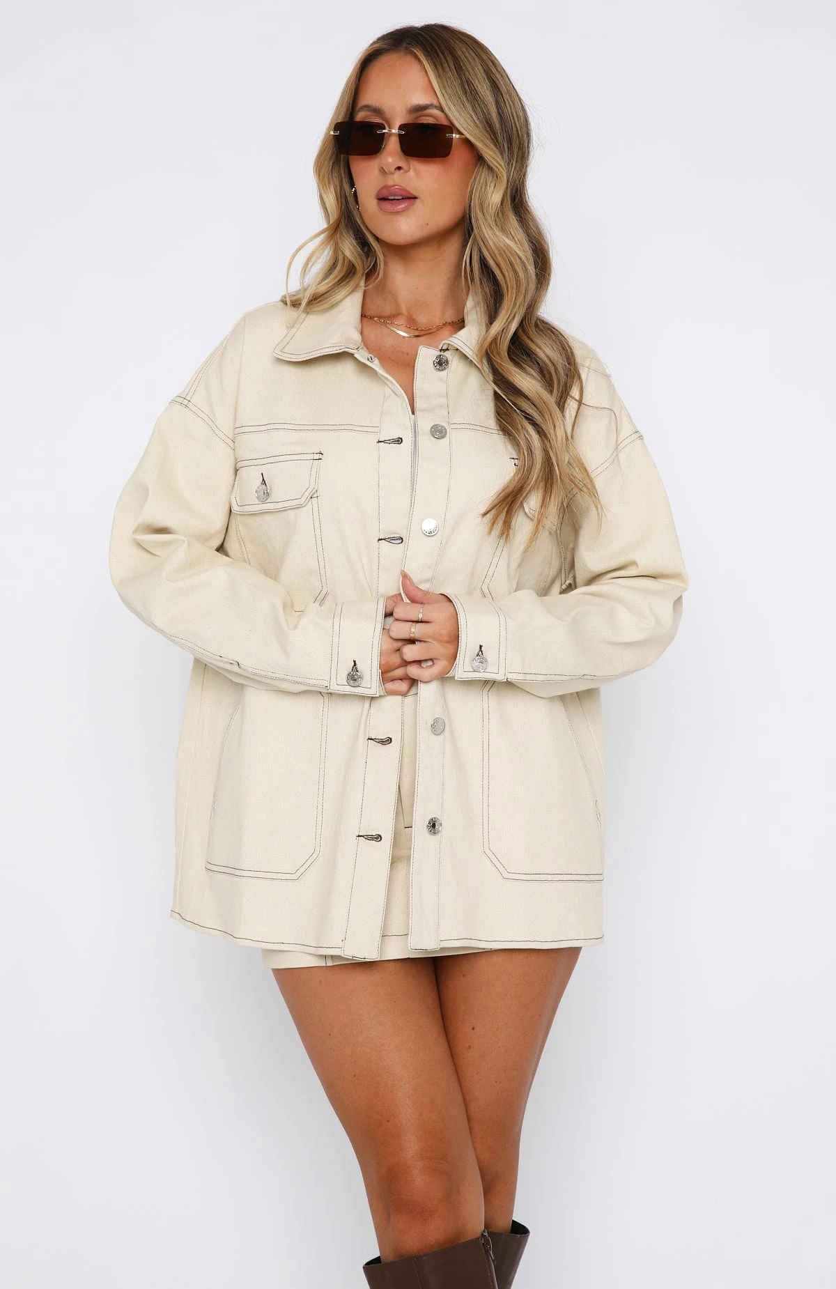 The Meet Me Backstage Oversized Jacket Cream were made for those last-minute plans! This jacket is an oversized fit and features collared neckline, front button and cuff closure, front pockets and contrast stitching. We love this paired with the matching Lesson Learned Mini Skirt and sneakers for a look we love!